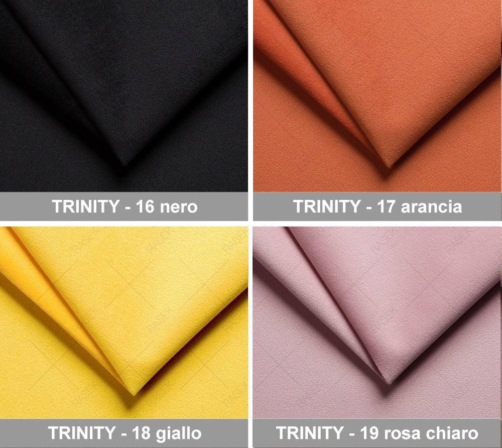 TEJIDO : TRINITY - Popular tejido de tapicería de terciopelo. Se caracteriza por una estructura delicada y una superficie recubierta de fina pelusa, suave y agradable al tacto. Sutiles matices de material y colores mate. ¡Resistente a la abrasión, a la descamación y a la luz! El tejido tiene las propiedades de absorción limitada de líquidos, lo que tiene un efecto positivo en el mantenimiento de la limpieza.